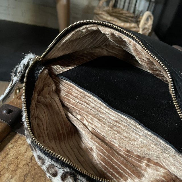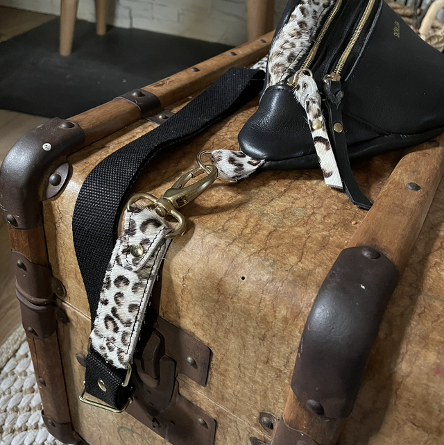 Sac banane en cuir lisse noir pleine fleur et bande cuir léopard poil.